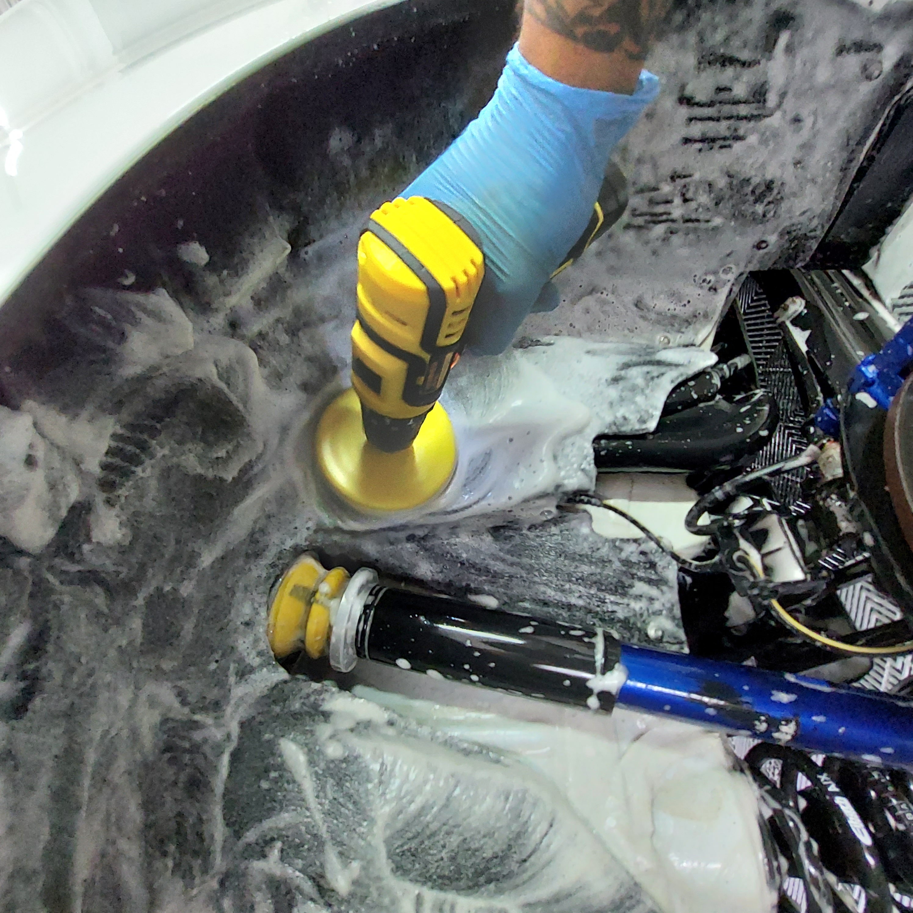 Limpeza detalhada das caixas de rodas, sistema de suspensão e pinças de freio.